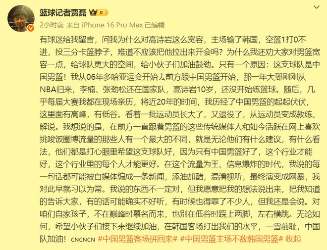 中国男篮世预赛首秀憾负韩国队,没有守住自己的主场,遭遇开门黑,大家心里不好受是可以理解的。但是,竟然有人还在带高诗岩的节奏、阴阳他,那就太不应该了。因为胡明轩的表现还远不如高诗岩,就算有徐杰,也不一定能赢韩国队!